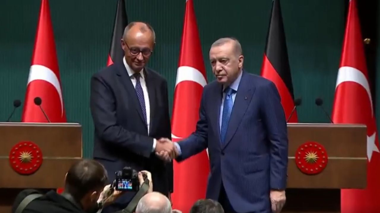 Almanya Başbakanı Freidric Merz, Türkiye ziyareti kapsamında Cumhurbaşkanı Recep Tayyip Erdoğan'la görüştü. Görüşmeden sonra Erdoğan ve Merz daha sonra basın açıklaması yaptı