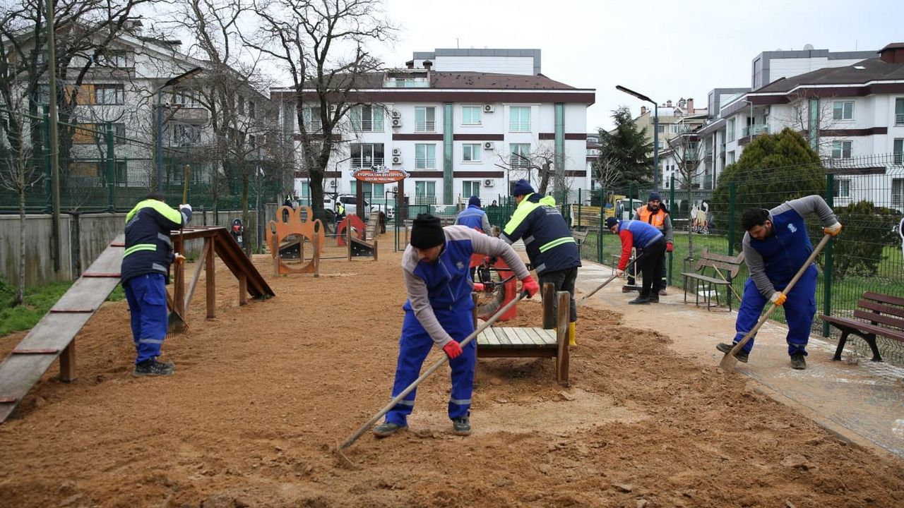 Yapılan çalışmalar kapsamında zarar gören kum alanını tamamen yenilenirken, yağmur nedeniyle tıkanan mazgalları temizlendi. Ayrıca kilit taşı onarımlarını tamamlanarak alan güvenli hale getirildi.
