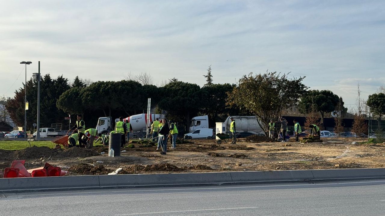 Göktürk girişine yakın bir noktada sürdürülen çalışmalarda belediye ekiplerinin ağaç dikimi, toprak hazırlığı ve genel peyzaj uygulamaları yaptığı görülüyor. Sahada çok sayıda işçi, iş makineleri ve nakliye araçları ile birlikte koordineli şekilde çalışıyor.